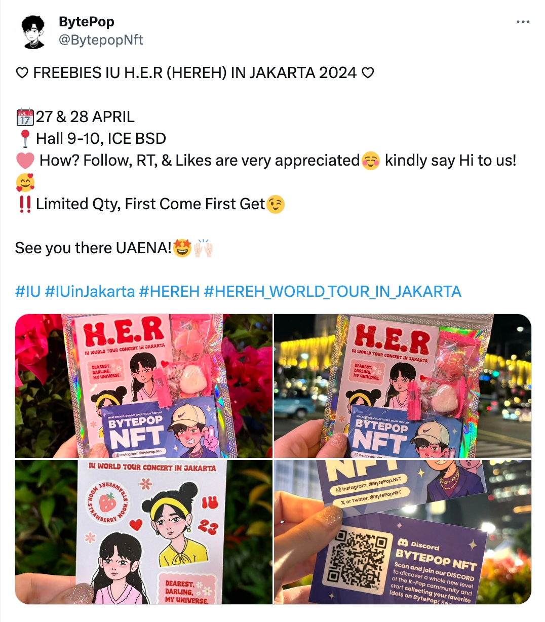 As one of the methods, we gave out freebies at the IU's concert, one of the K-Pop idols. This was the first step to share BytePop's presence and connecting with K-Popers in a real and memorable way.